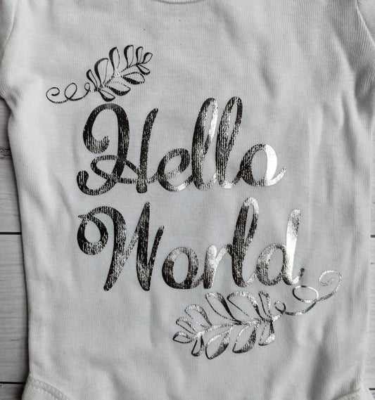 Newborn Outfit, Hello World Birth Announcement Onesie Bodysuit and Baby Hat