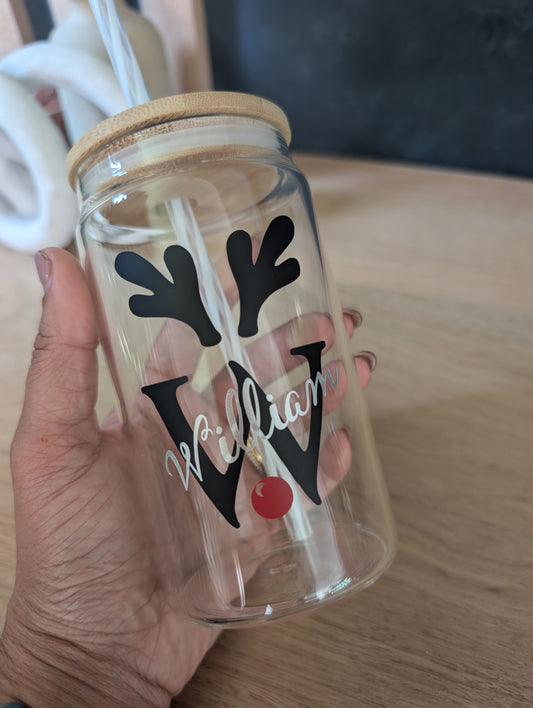 Christmas Reindeer personalised Reusable Glass Can Tumbler Cup with Straw