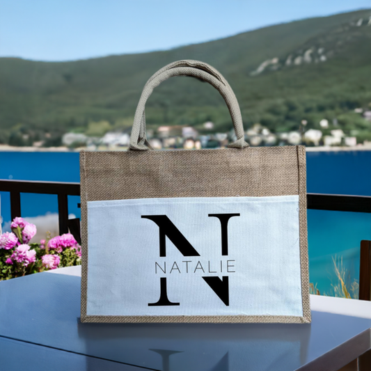 Personalised Jute/Burlap Tote Bag with Canvas Pocket