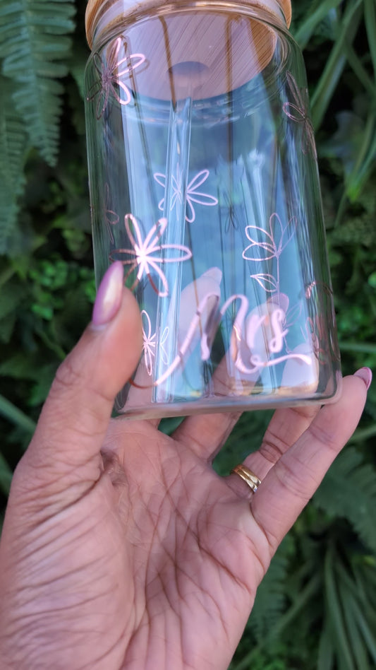 Floral Design Reusable Glass Can Tumbler Cup with Straw